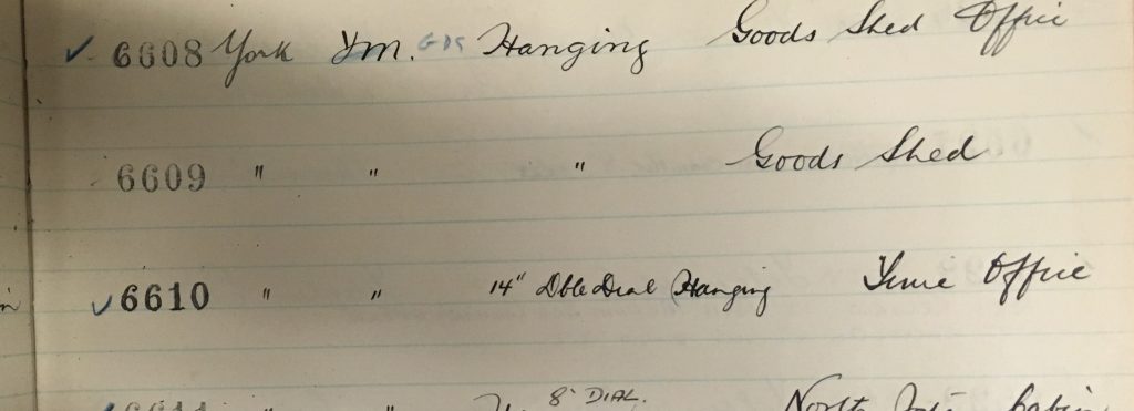 The page shown lists some of the clocks from York. Most will have long disappeared from their original location, but at least one is still in place, and you may well have walked past it if you have ever visited the National Railway Museum. It is the 6610, a 14-inch double-dial hanging clock located at York Goods Time Office. This stands outside the goods shed that is now our Station Hall and the time office is now the office for the Friends of the National Railway Museum.