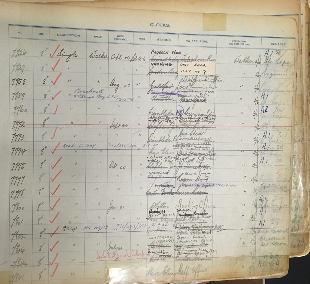 Railway companies owned tens of thousands of clocks. Each signal box would have one, stations would have clocks in the booking office, on the platform, in the waiting rooms and in the station master’s office. Large stations could have huge numbers of clocks, all of which needed to be kept to time, and of course there were also clocks in offices, railway works and goods depots—time was so vital to the operation of the system. With so many clocks, the companies needed to know where each one was located so that they could ensure they were maintained in good order. So just like all the locomotives and rolling stock, the railway companies numbered and kept records of their clocks!