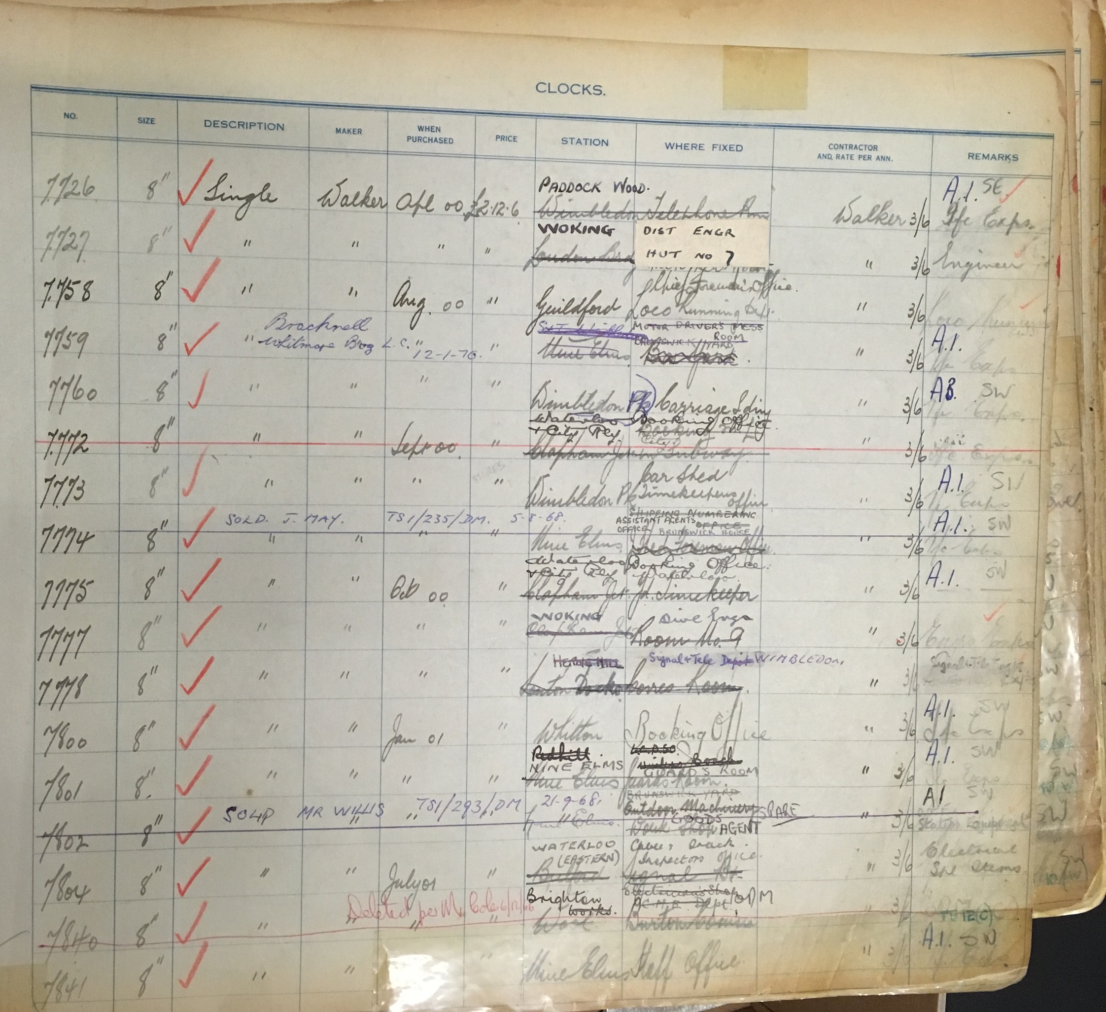 We also have some registers for Southern Railway clocks. Southern seem to have taken another approach to their clock re-numbering issue—rather than have a completely new set of numbers, they decided to put prefixes on the existing clock numbers to designate what area they were from.