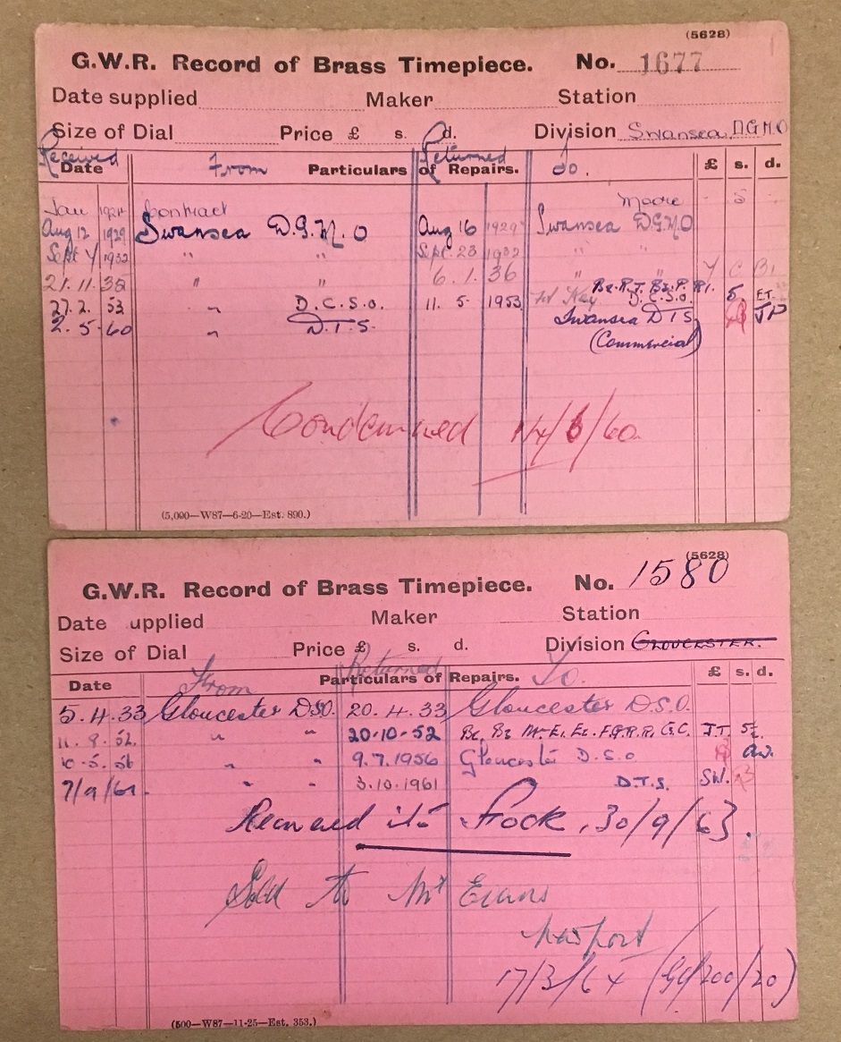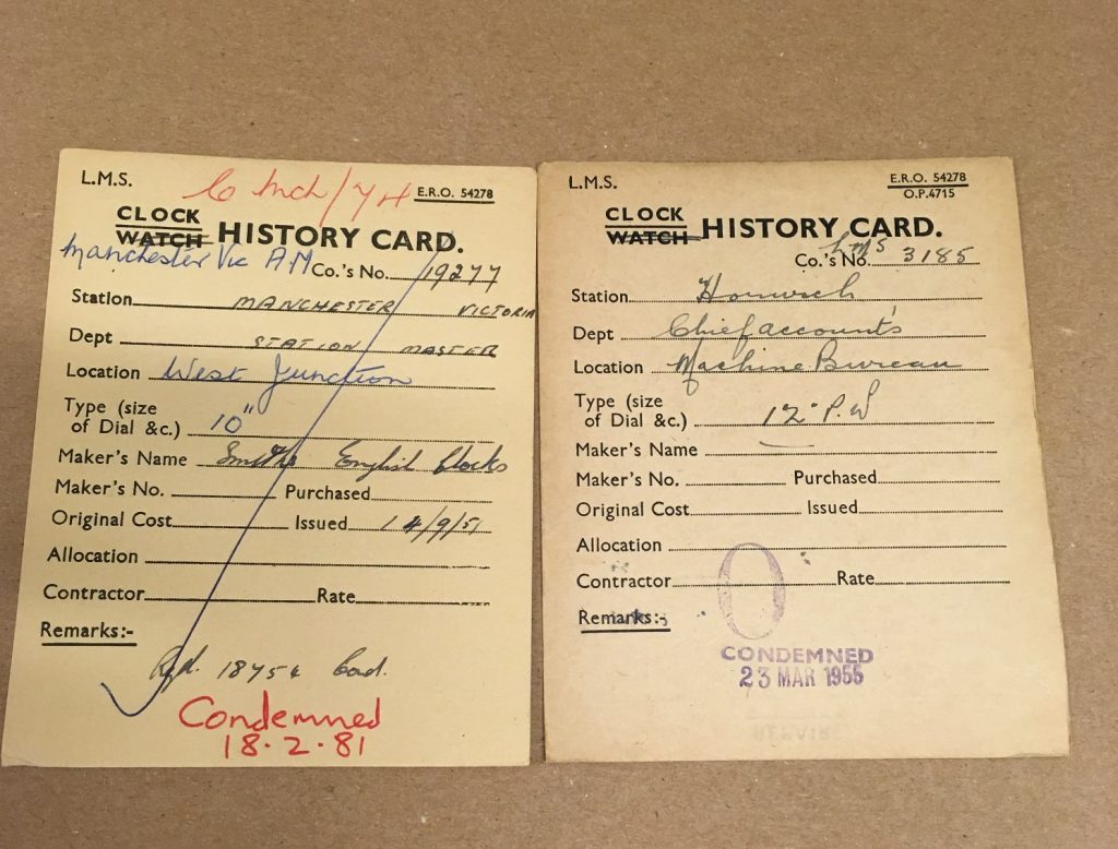 We have a similar set of cards for the GWR, although it would appear that the majority of the clocks that we hold cards for were scrapped, so are not often not of of much help for people looking for a record of their old Great Western clock.