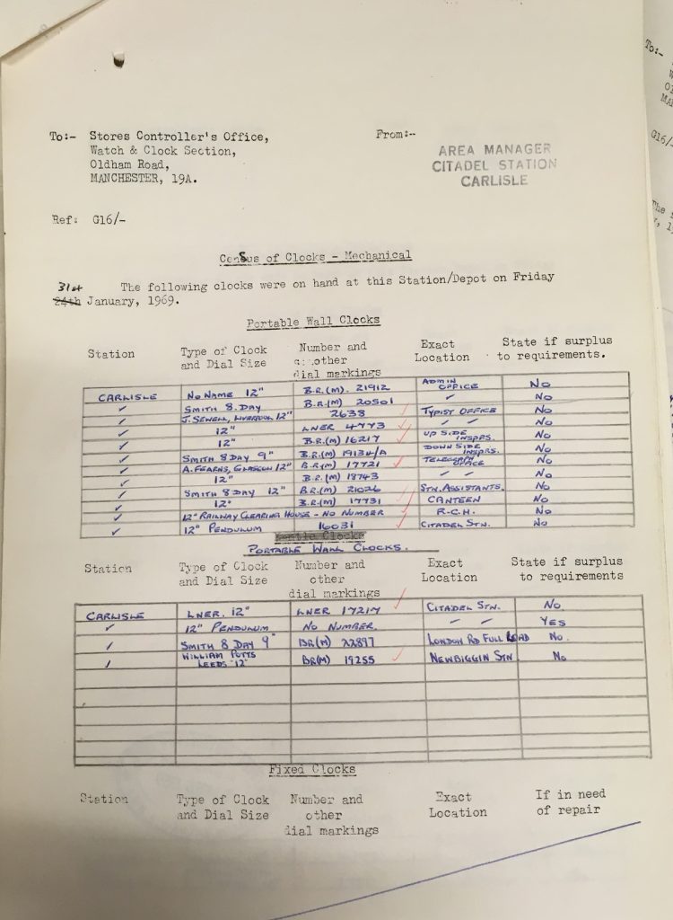 The final type of record we hold are clock census records. We have a series of returns for a census carried out by British Railway London Midland Region in 1969. These consist of sheets returned by each station or depot. Below is one of the sheets for Carlisle Citadel station, a large station that had many clocks, this is just one of a number of sheets for the station. The information includes the manufacturer where known, and also whether the clock is “surplus to requirements”. As these records are organised by location, it isn’t really possible to find a location just by knowing the number, you would have to search through all the sheets!