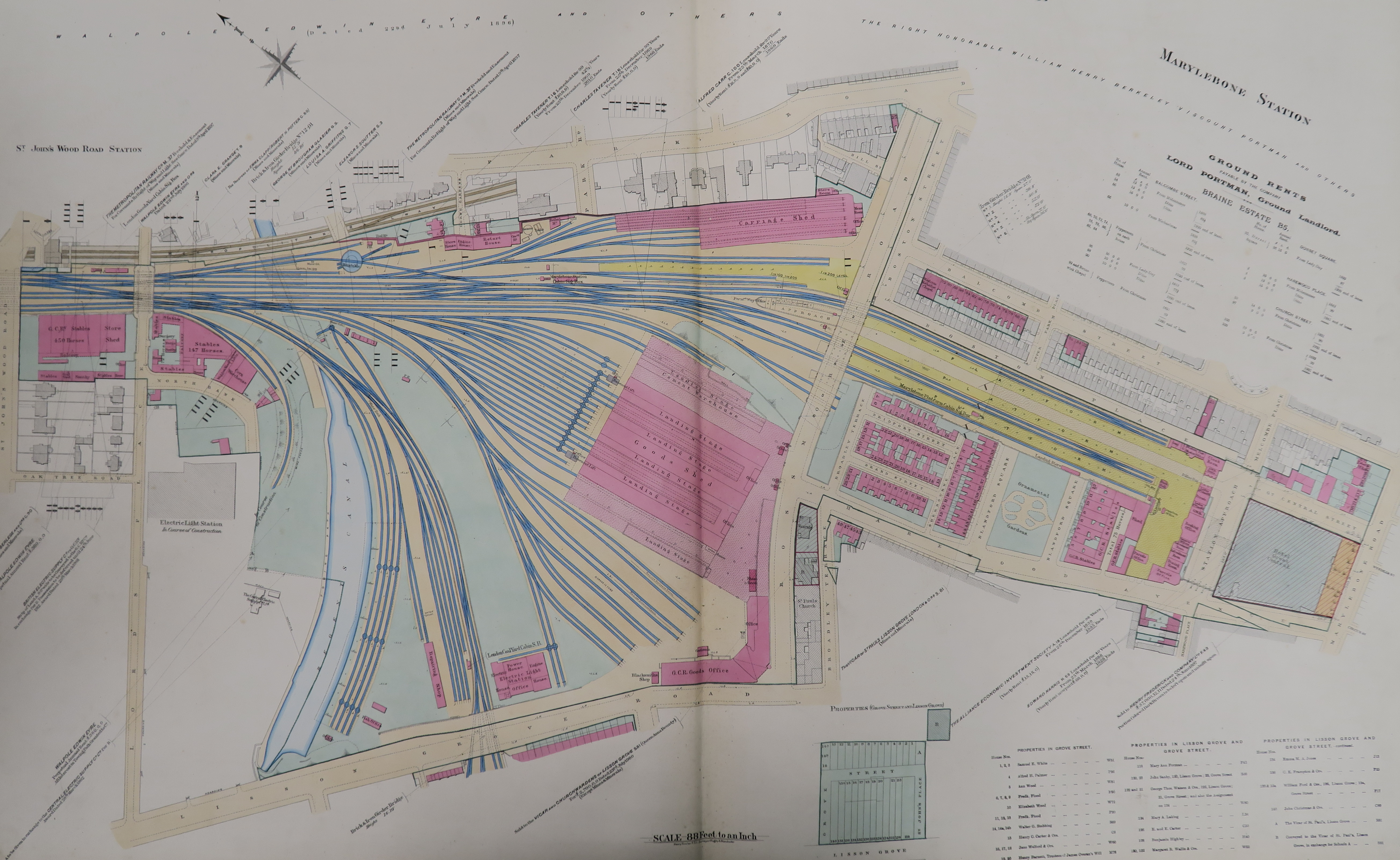 The land plans depict the spread of the railways spread across the English countryside where they faced opposition from wealthy landowners opposed to the railways crossing their estates. As the Great Central Railway was extended into Marylebone station in the late nineteenth century even the hallowed turf of Lord’s Cricket ground was threatened, raising outcry amongst cricket fans.
