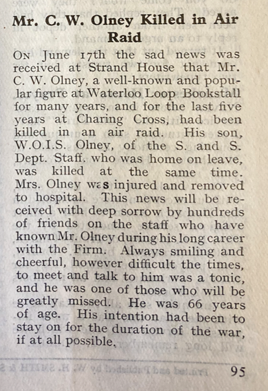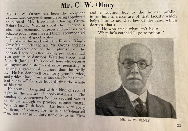 I can think of no better tribute to Mr Olney than what one of his bookstall assistants said of him after learning about his death: “I can say no more than that the Firm and his family have lost a fine man, a man for whom it was a pleasure to work, someone whom honest people love and whom the dishonest feared” (Newsbasket, August 1944).